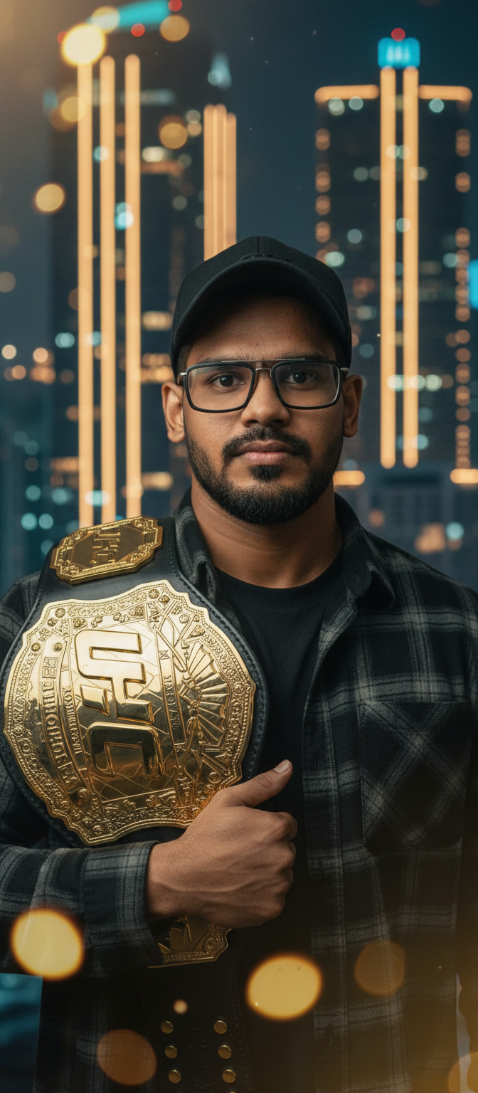 Ultra-realistic cinematic portrait of @yasi athletic lightweight champion male fighter wearing modern specs, a black baseball cap and black-gray plaid …