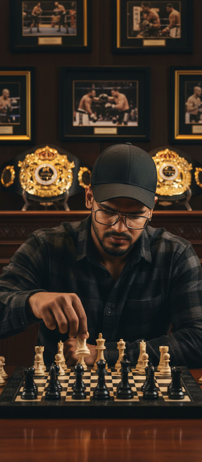 Cinematic ultra-realistic portrait of @yasi wearing modren specs athletic male fighter sitting at a table playing chess, wearing a black …