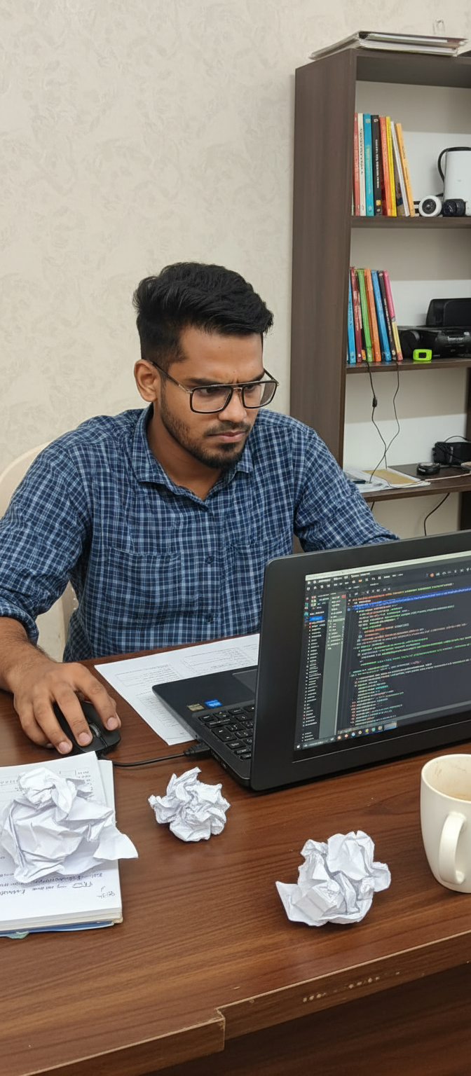 Photo of you at @yasi desk, frustrated/focused expression, with your laptop visible. The emotion matters here.